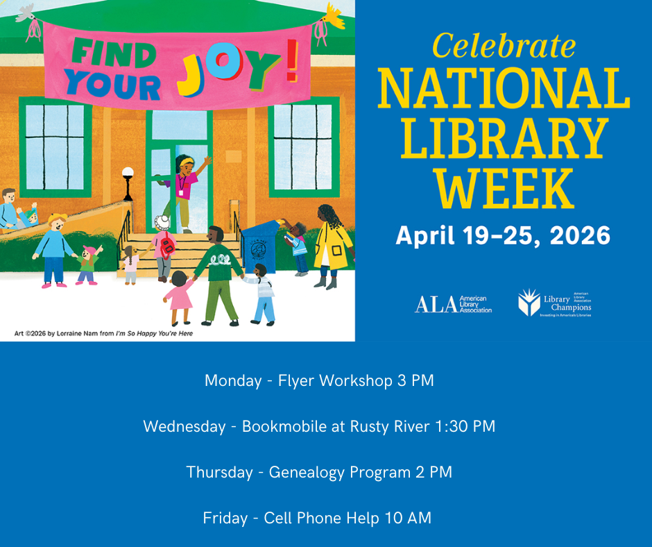 Join us for special programs throughout National Library Week. Monday at 3 PM will be a Flyer Workshop with Canva, Thursday will be a Genealogy program at 2 PM, Cell Phone Help on Friday at 10 AM.